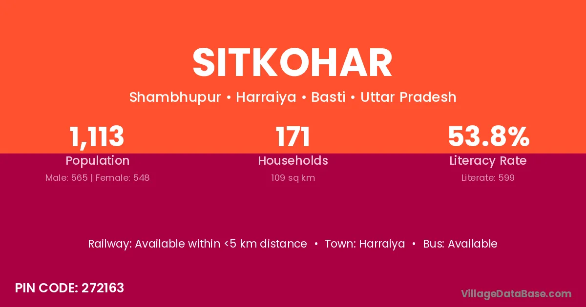 Sitkohar village has a total population of 1,113 people, of which 565 are males and 548 are females.