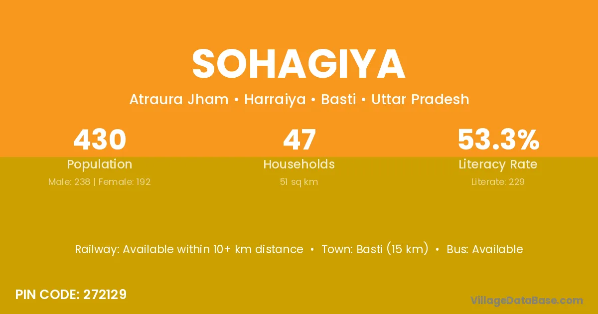 Basti (15 km) is the nearest town to Sohagiya village for major economic activities and is located approximately 15 km away.