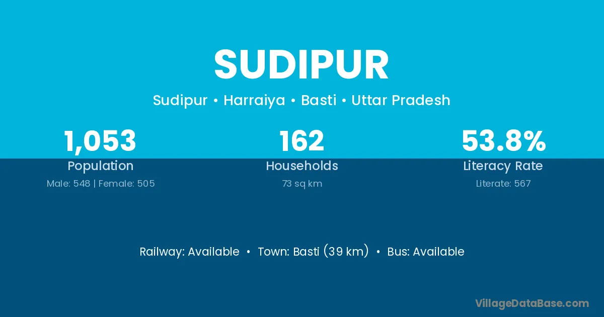 Basti (39 km) is the nearest town to Sudipur village for major economic activities and is located approximately 39 km away.