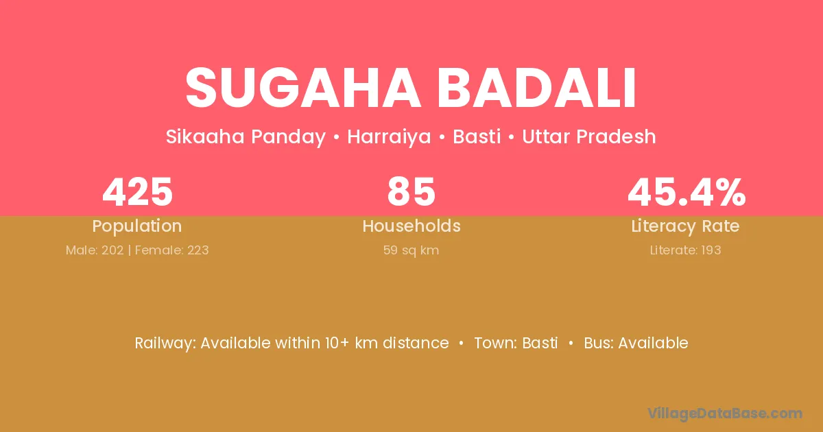 Sugaha Badali village has a total population of 425 people, of which 202 are males and 223 are females.