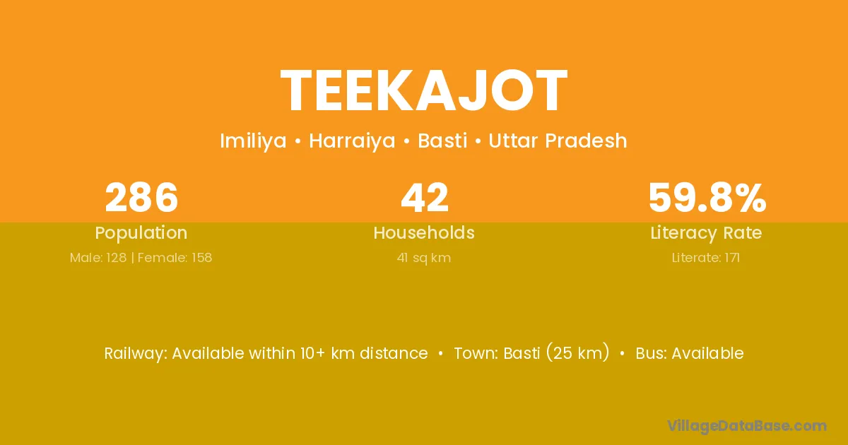 Basti (25 km) is the nearest town to Teekajot village for major economic activities and is located approximately 25 km away.