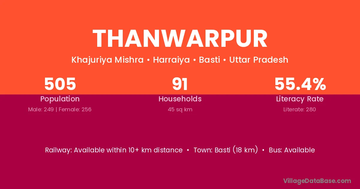 Thanwarpur village has a total population of 505 people, of which 249 are males and 256 are females.
