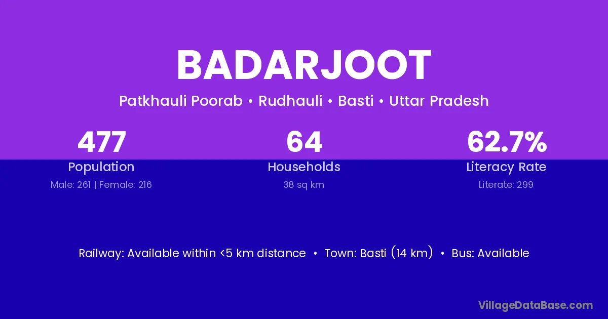 Basti (14 km) is the nearest town to Badarjoot village for major economic activities and is located approximately 14 km away.