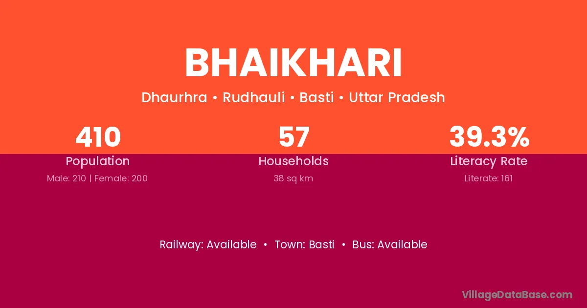 Bhaikhari village has a total population of 410 people, of which 210 are males and 200 are females.