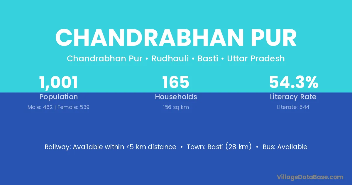 Basti (28 km) is the nearest town to Chandrabhan Pur village for major economic activities and is located approximately 28 km away.