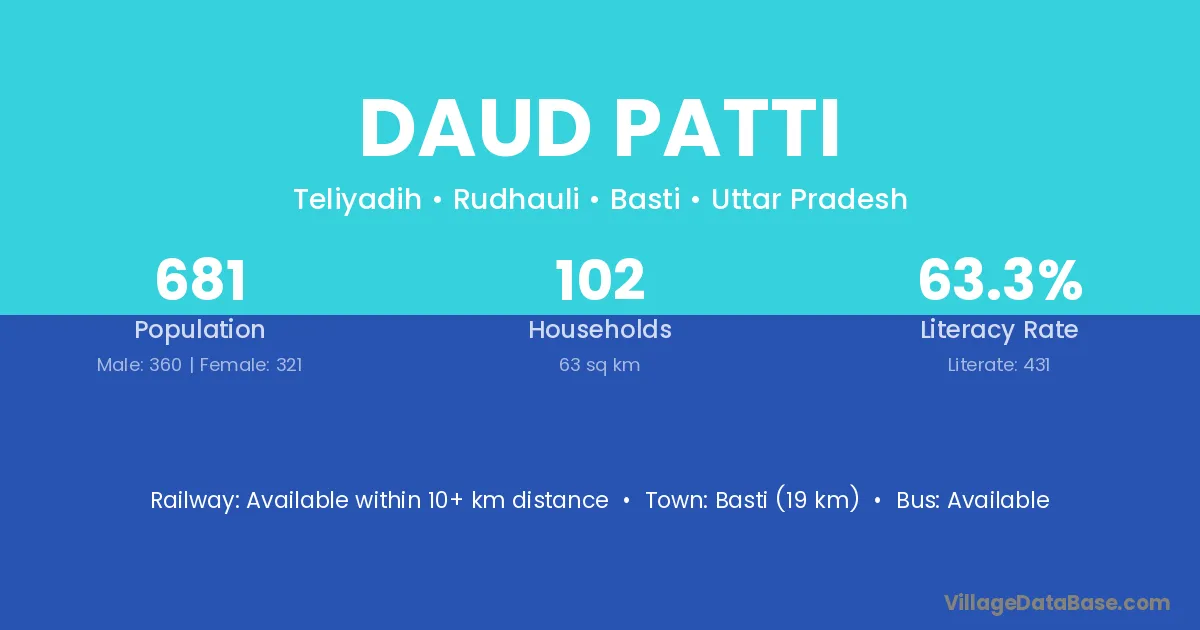 Basti (19 km) is the nearest town to Daud Patti village for major economic activities and is located approximately 19 km away.