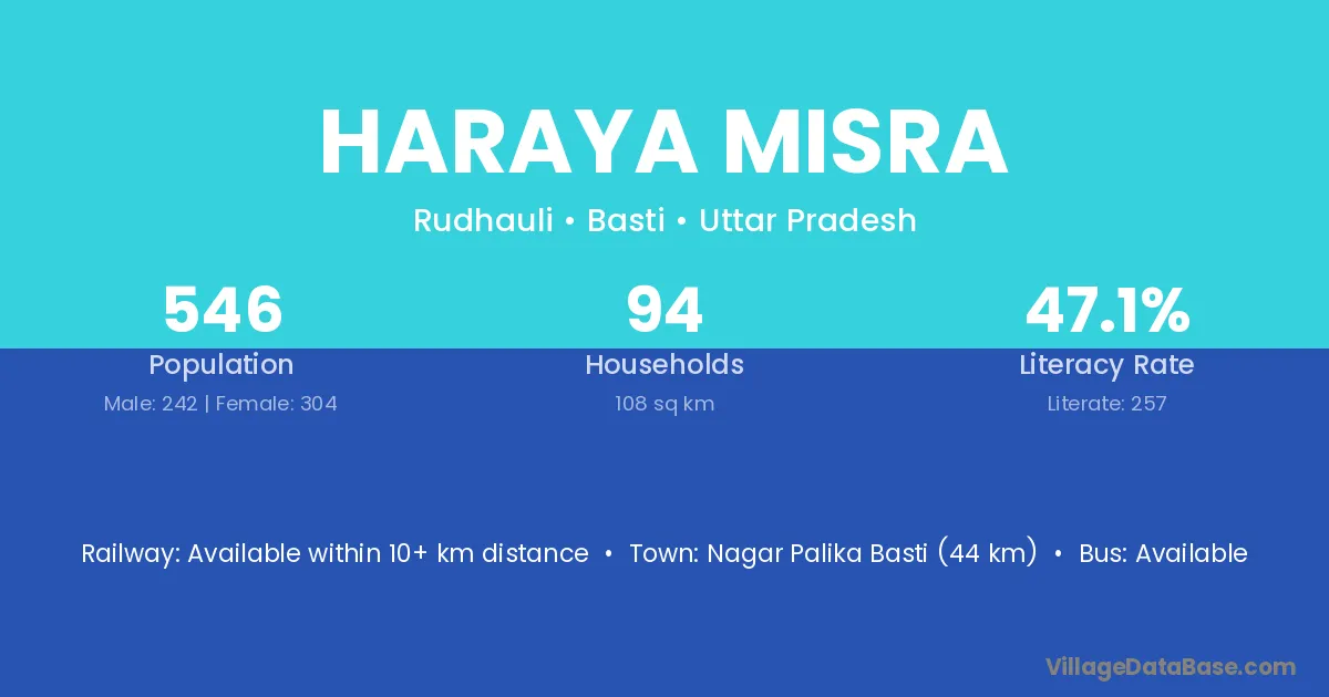 Nagar Palika Basti (44 km) is the nearest town to Haraya Misra village for major economic activities and is located approximately 44 km away.