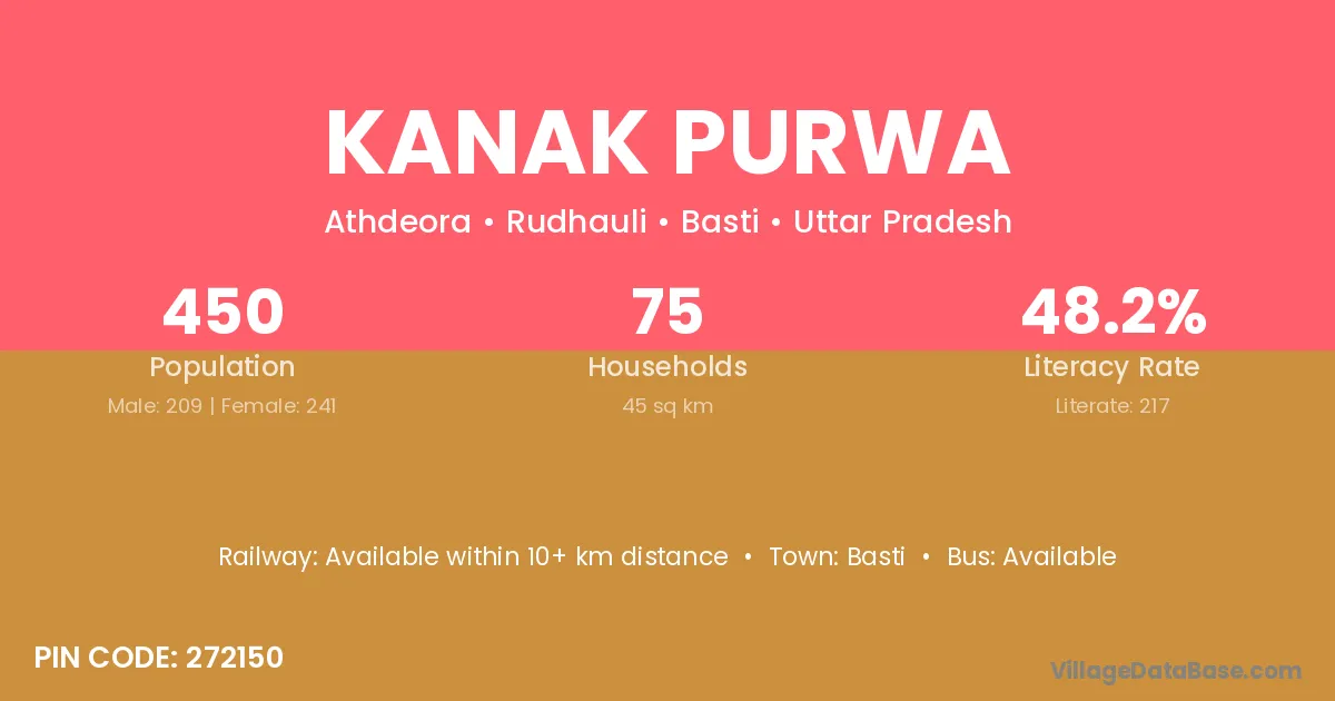 Kanak Purwa village has a total population of 450 people, of which 209 are males and 241 are females.