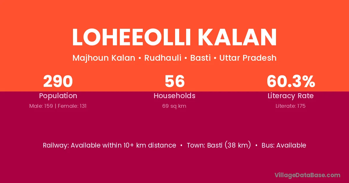 Basti (38 km) is the nearest town to Loheeolli Kalan village for major economic activities and is located approximately 38 km away.