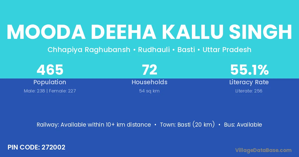 Basti (20 km) is the nearest town to Mooda Deeha Kallu Singh village for major economic activities and is located approximately 20 km away.