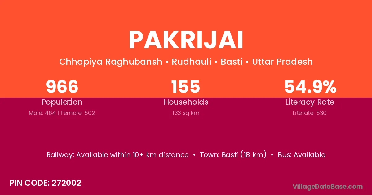 Basti (18 km) is the nearest town to Pakrijai village for major economic activities and is located approximately 18 km away.