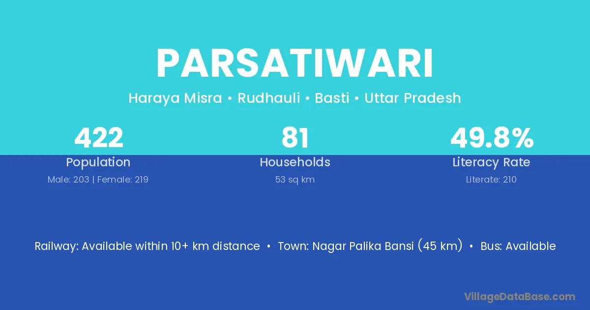 Nagar Palika Bansi (45 km) is the nearest town to Parsatiwari village for major economic activities and is located approximately 45 km away.
