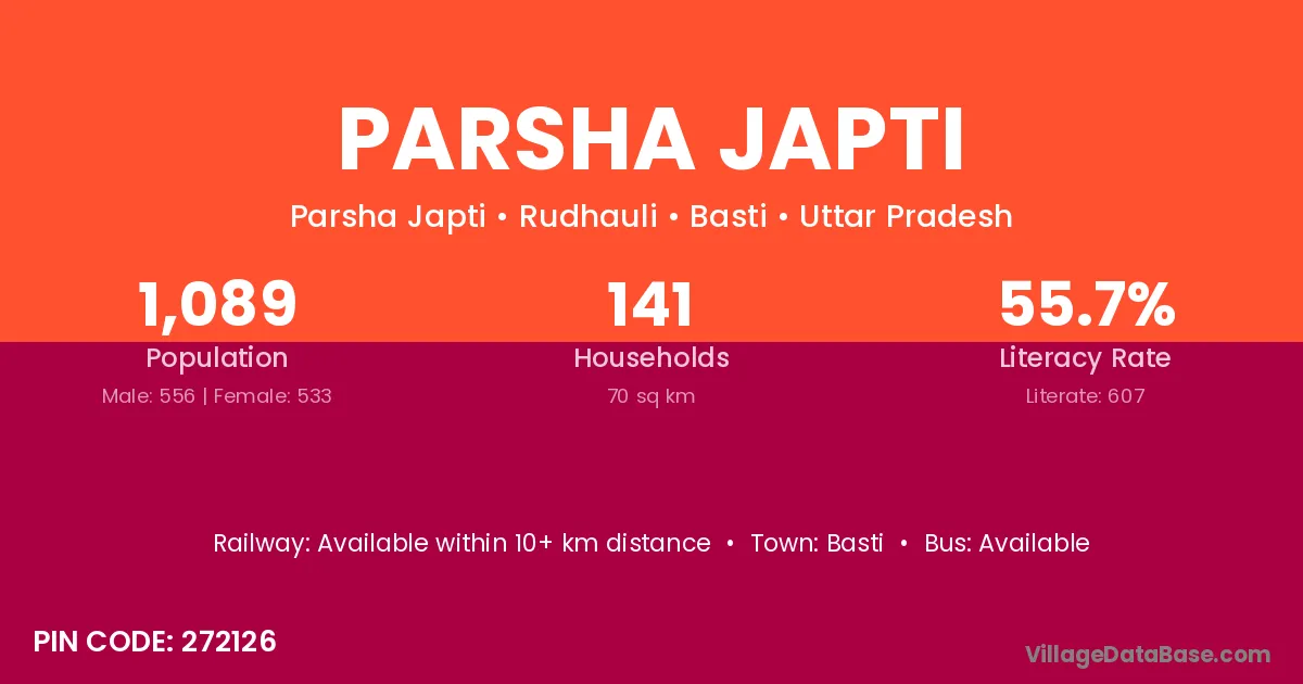 Parsha Japti village has a total population of 1,089 people, of which 556 are males and 533 are females.