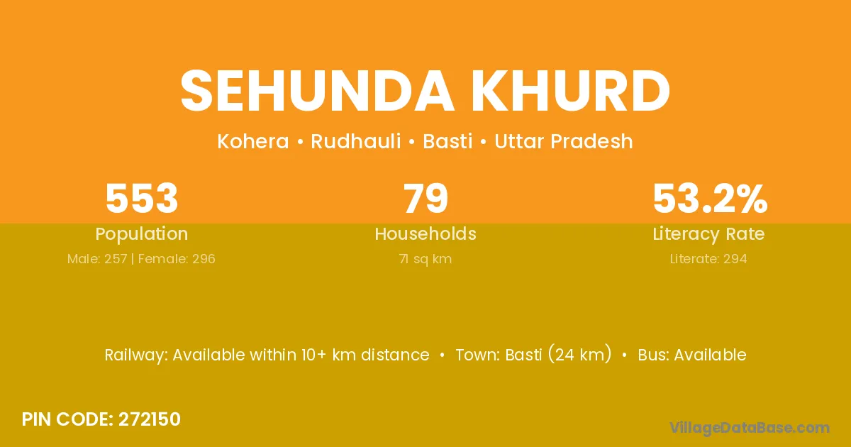Basti (24 km) is the nearest town to Sehunda Khurd village for major economic activities and is located approximately 24 km away.