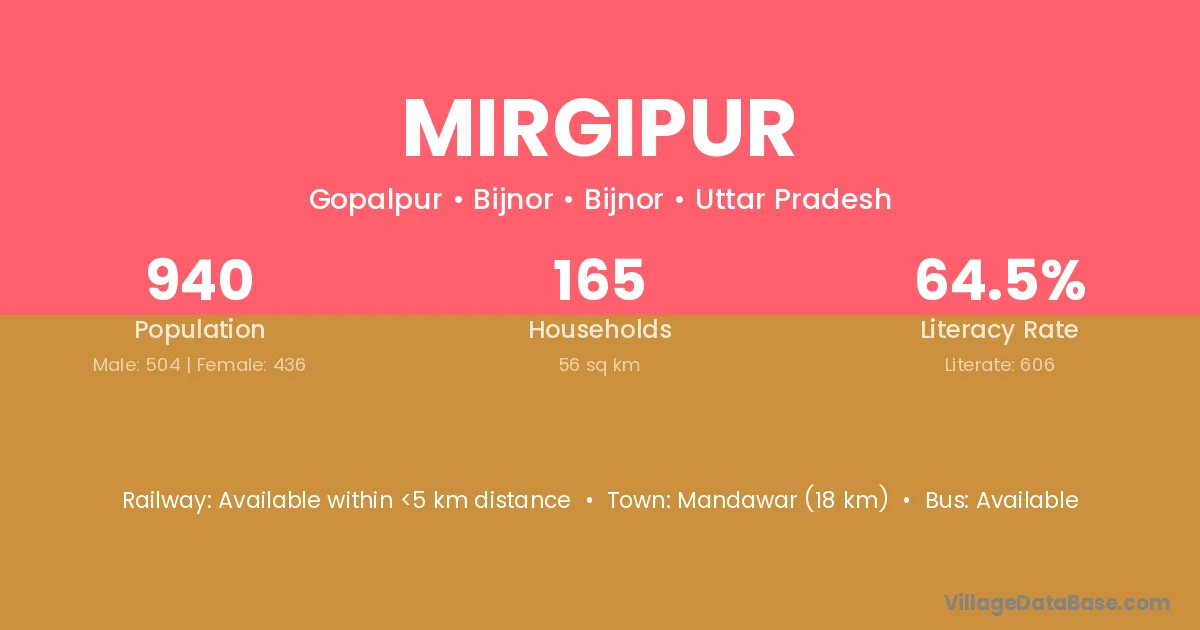 Mandawar (18 km) is the nearest town to Mirgipur village for major economic activities and is located approximately 18 km away.
