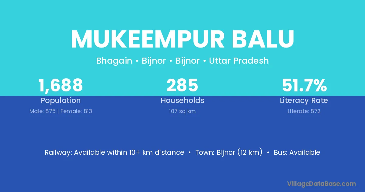 Bijnor (12 km) is the nearest town to Mukeempur Balu village for major economic activities and is located approximately 12 km away.