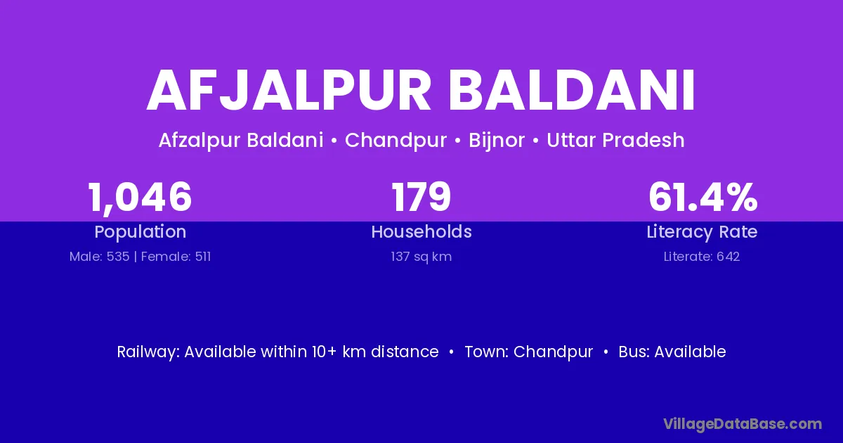 Afjalpur Baldani village has a total population of 1,046 people, of which 535 are males and 511 are females.