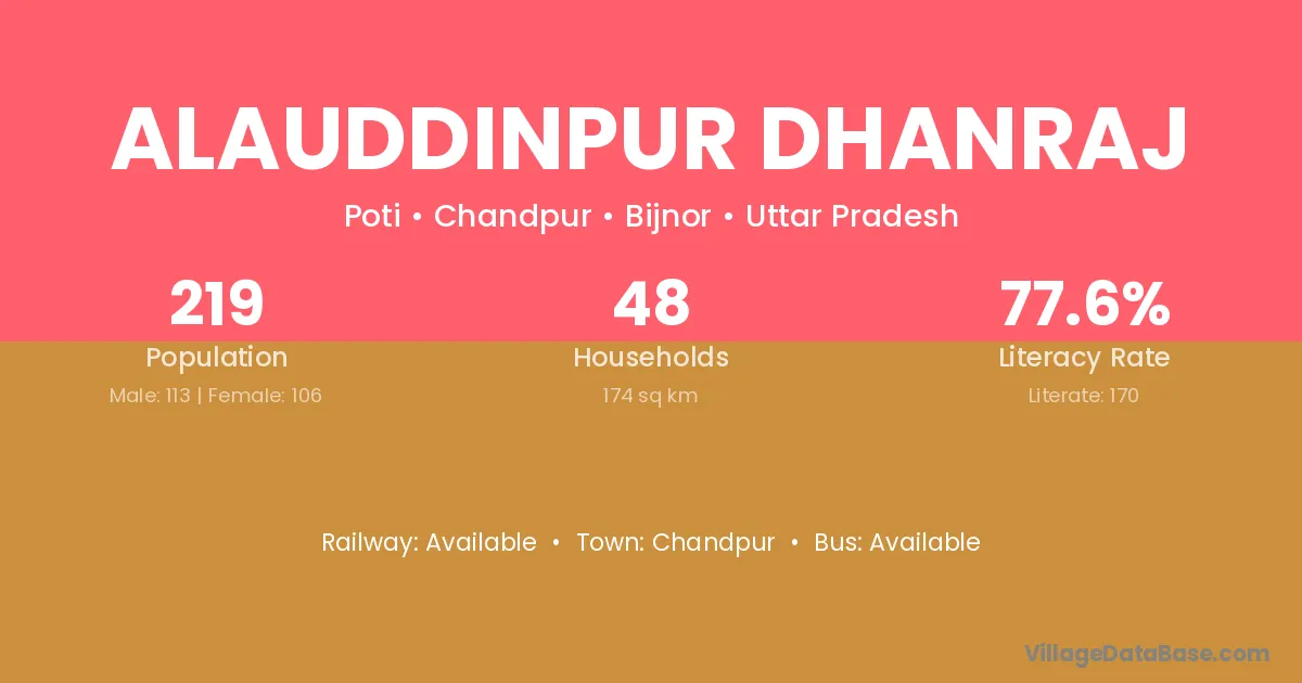 Alauddinpur Dhanraj village has a total population of 219 people, of which 113 are males and 106 are females.