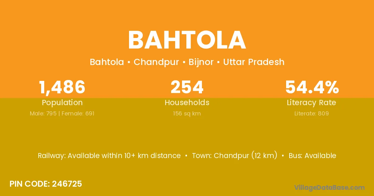 Chandpur (12 km) is the nearest town to Bahtola village for major economic activities and is located approximately 12 km away.