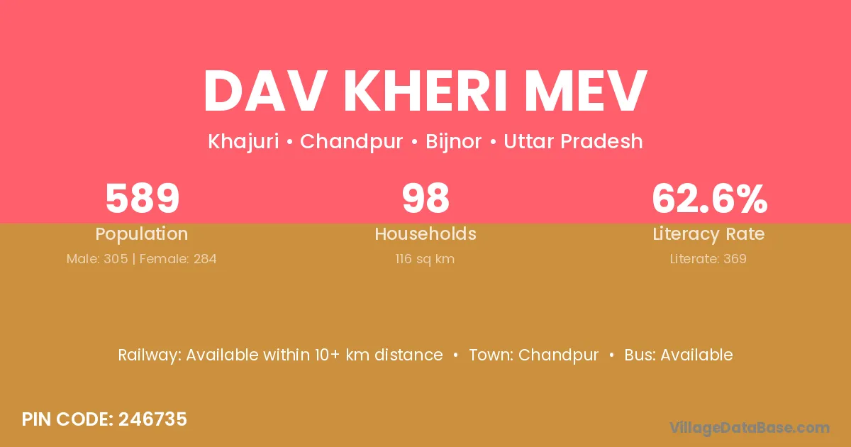 Dav Kheri Mev village has a total population of 589 people, of which 305 are males and 284 are females.
