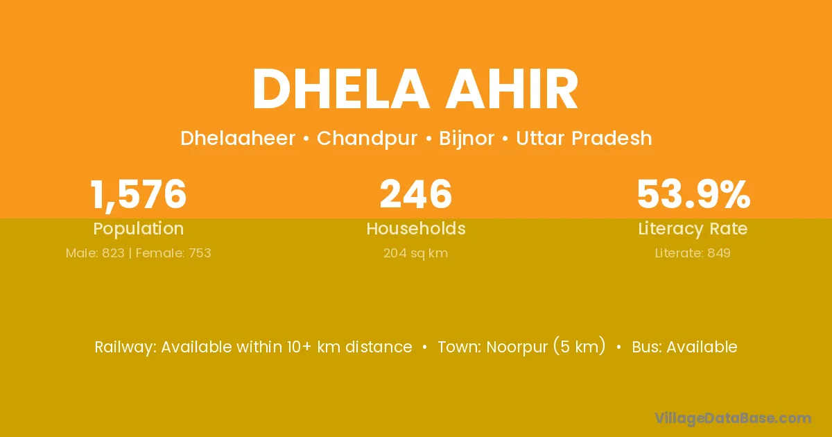 Noorpur (5 km) is the nearest town to Dhela Ahir village for major economic activities and is located approximately 5 km away.