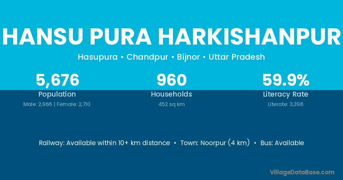 Hansu Pura Harkishanpur village has a total population of 5,676 people, of which 2,966 are males and 2,710 are females.