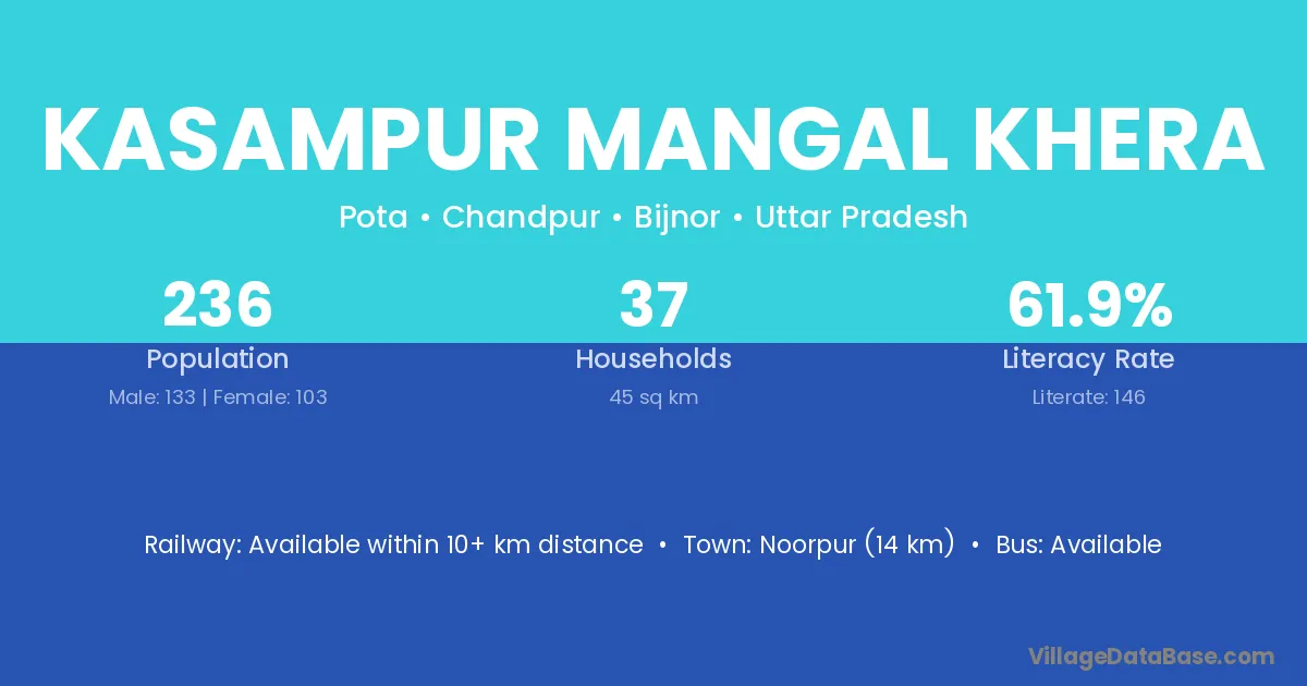 Noorpur (14 km) is the nearest town to Kasampur Mangal Khera village for major economic activities and is located approximately 14 km away.