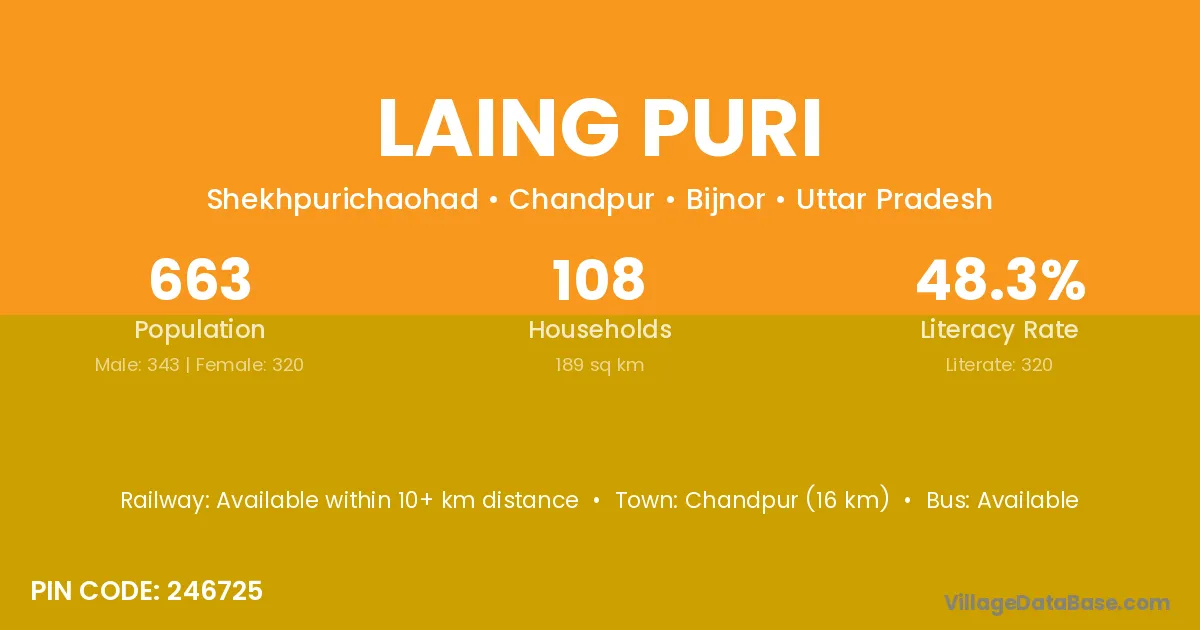Chandpur (16 km) is the nearest town to Laing Puri village for major economic activities and is located approximately 16 km away.