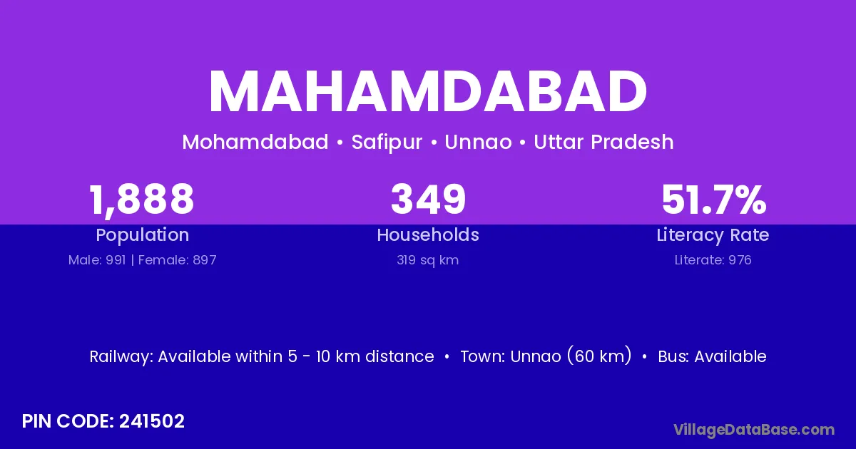 The literacy rate of Mahamdabad village is 60.93%. Male literacy stands at 67.96% and female literacy at 53.15%.