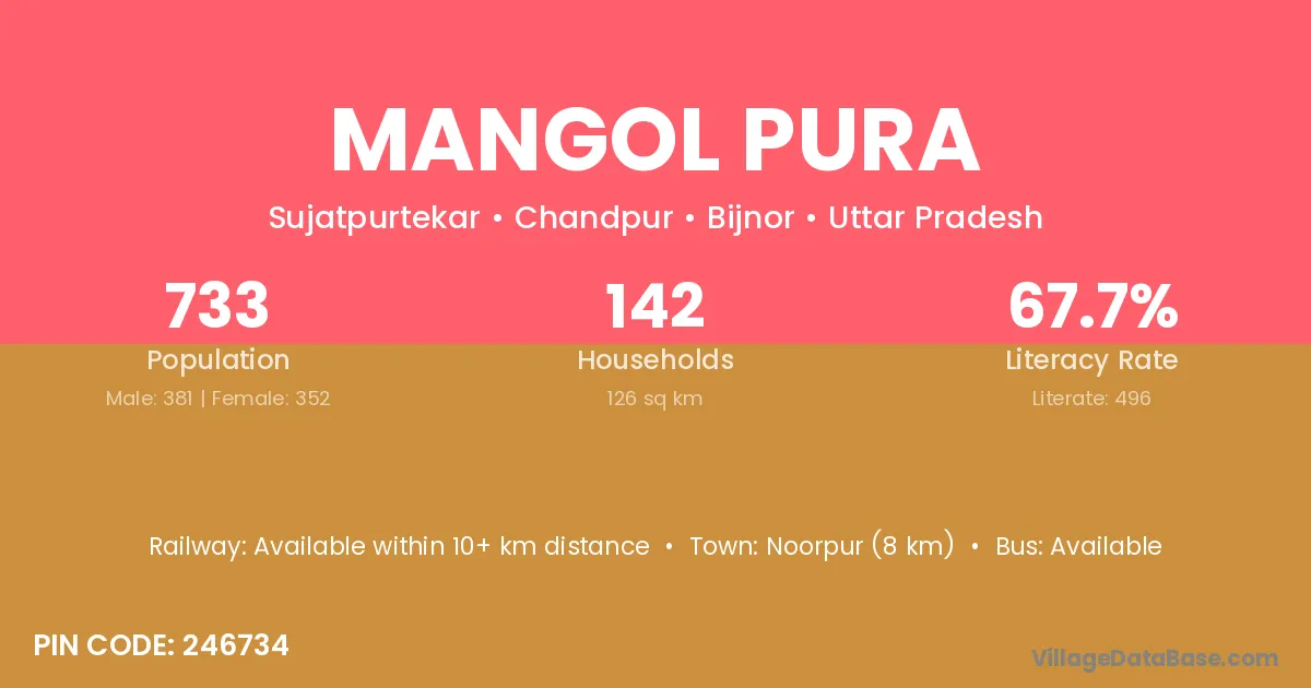 Mangol Pura village has a total population of 733 people, of which 381 are males and 352 are females.
