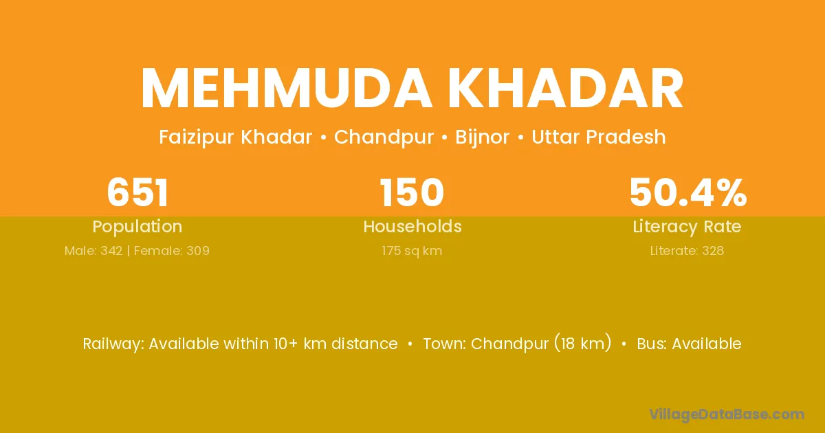 Chandpur (18 km) is the nearest town to Mehmuda Khadar village for major economic activities and is located approximately 18 km away.