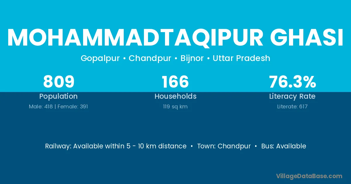 Mohammadtaqipur Ghasi village has a total population of 809 people, of which 418 are males and 391 are females.