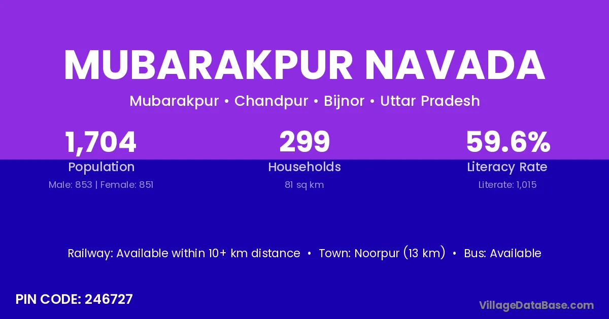 Noorpur (13 km) is the nearest town to Mubarakpur Navada village for major economic activities and is located approximately 13 km away.