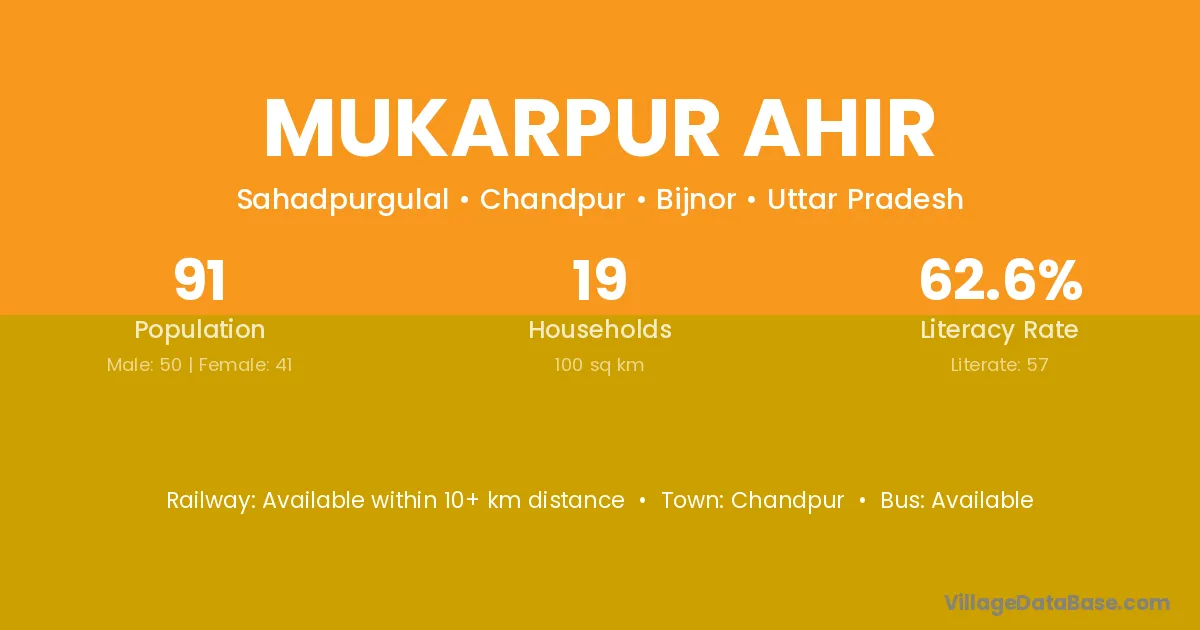 Mukarpur Ahir village has a total population of 91 people, of which 50 are males and 41 are females.