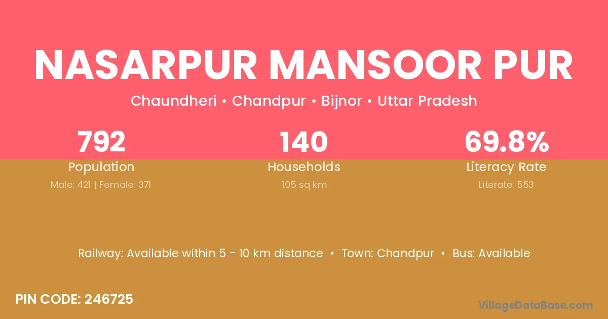 Nasarpur Mansoor Pur village has a total population of 792 people, of which 421 are males and 371 are females.