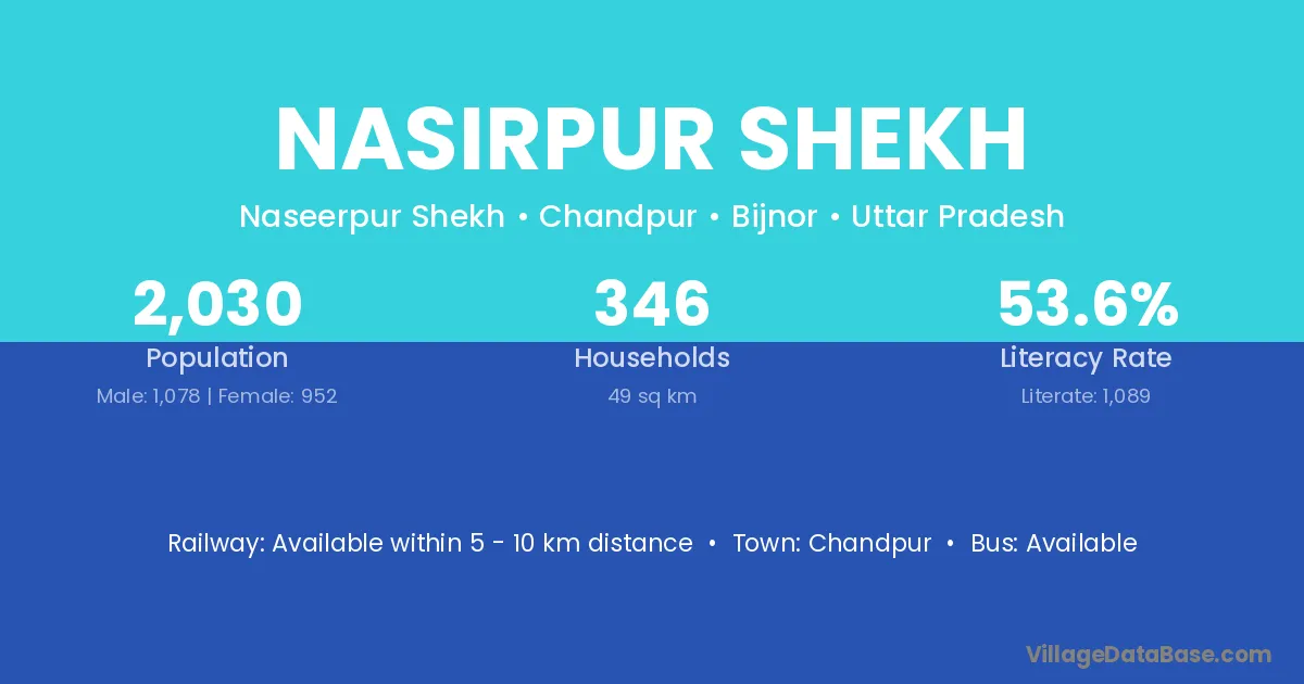 Nasirpur Shekh village has a total population of 2,030 people, of which 1,078 are males and 952 are females.