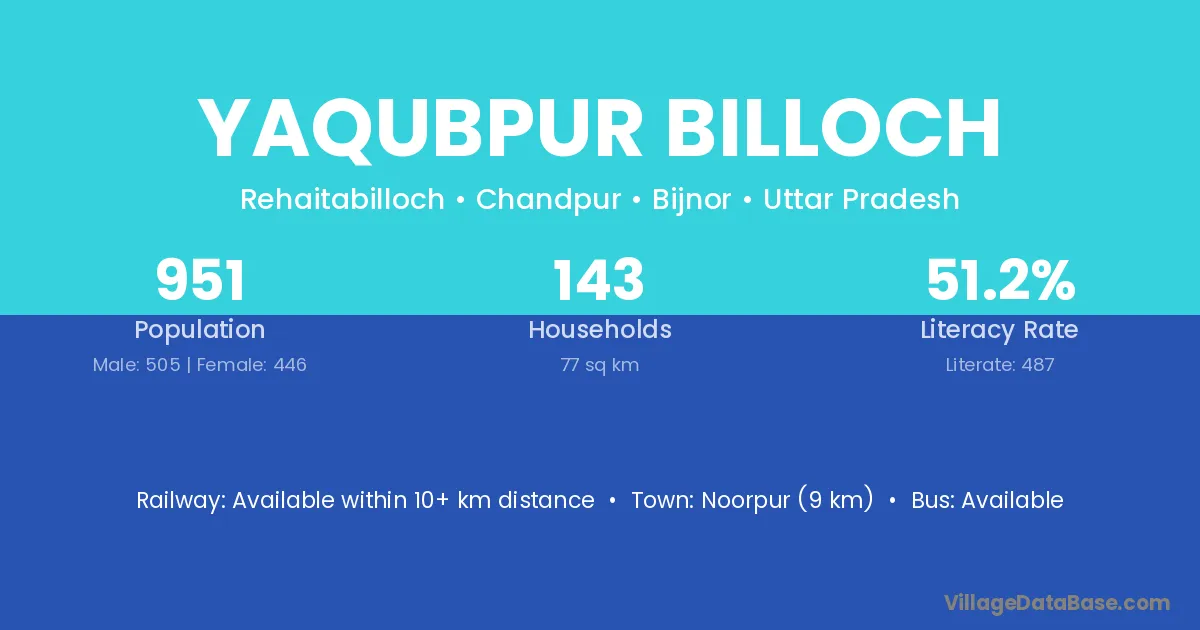 Yaqubpur Billoch village has a total population of 951 people, of which 505 are males and 446 are females.