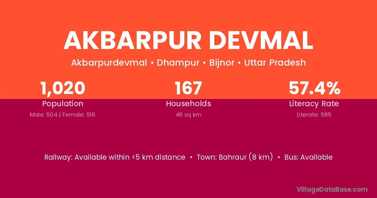 Akbarpur Devmal village has a total population of 1,020 people, of which 504 are males and 516 are females.