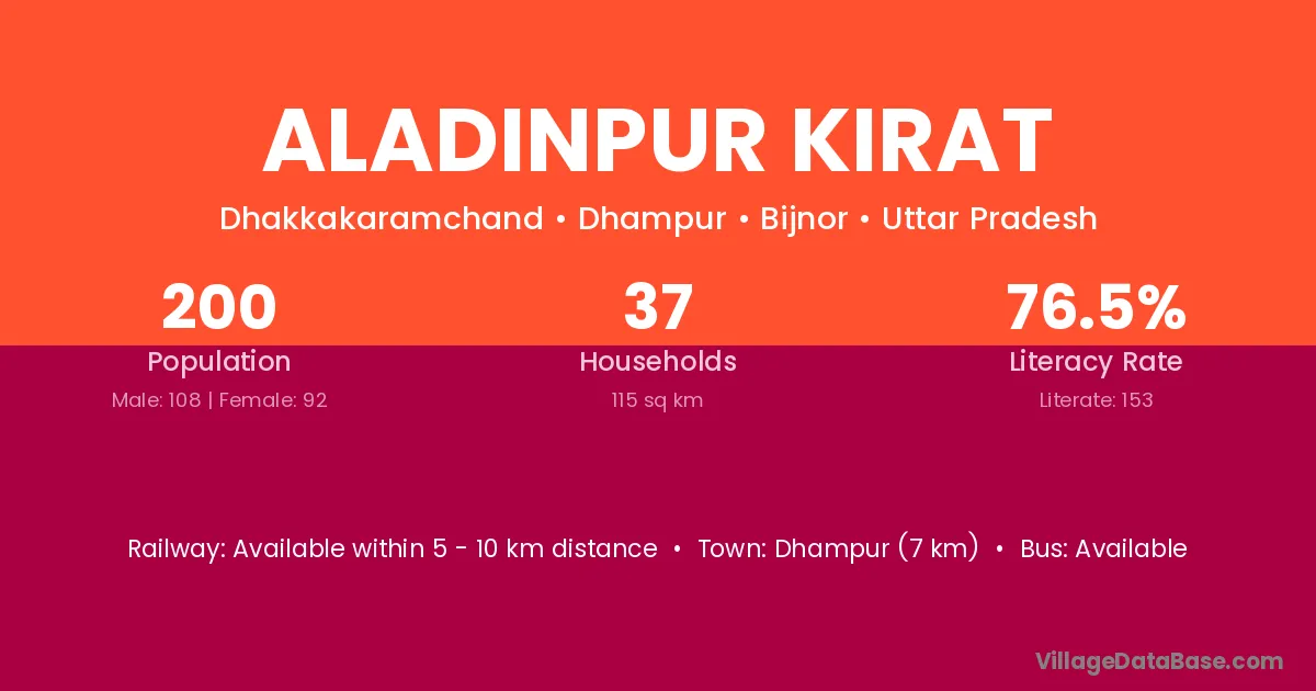 Dhampur (7 km) is the nearest town to Aladinpur Kirat village for major economic activities and is located approximately 7 km away.