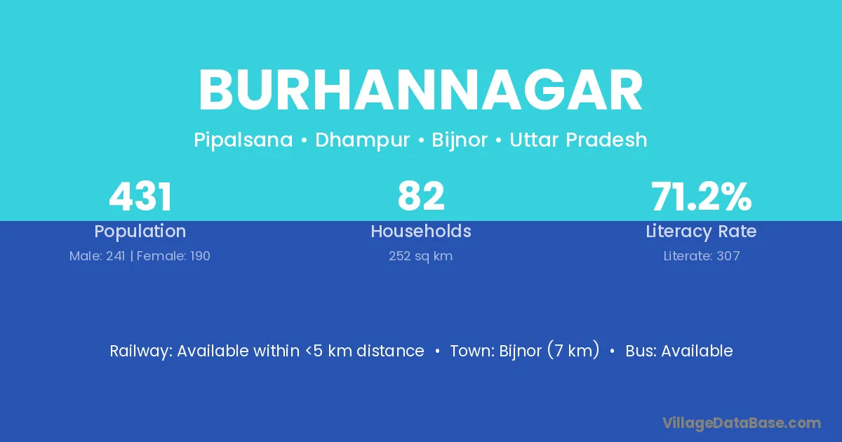 Bijnor (7 km) is the nearest town to Burhannagar village for major economic activities and is located approximately 7 km away.