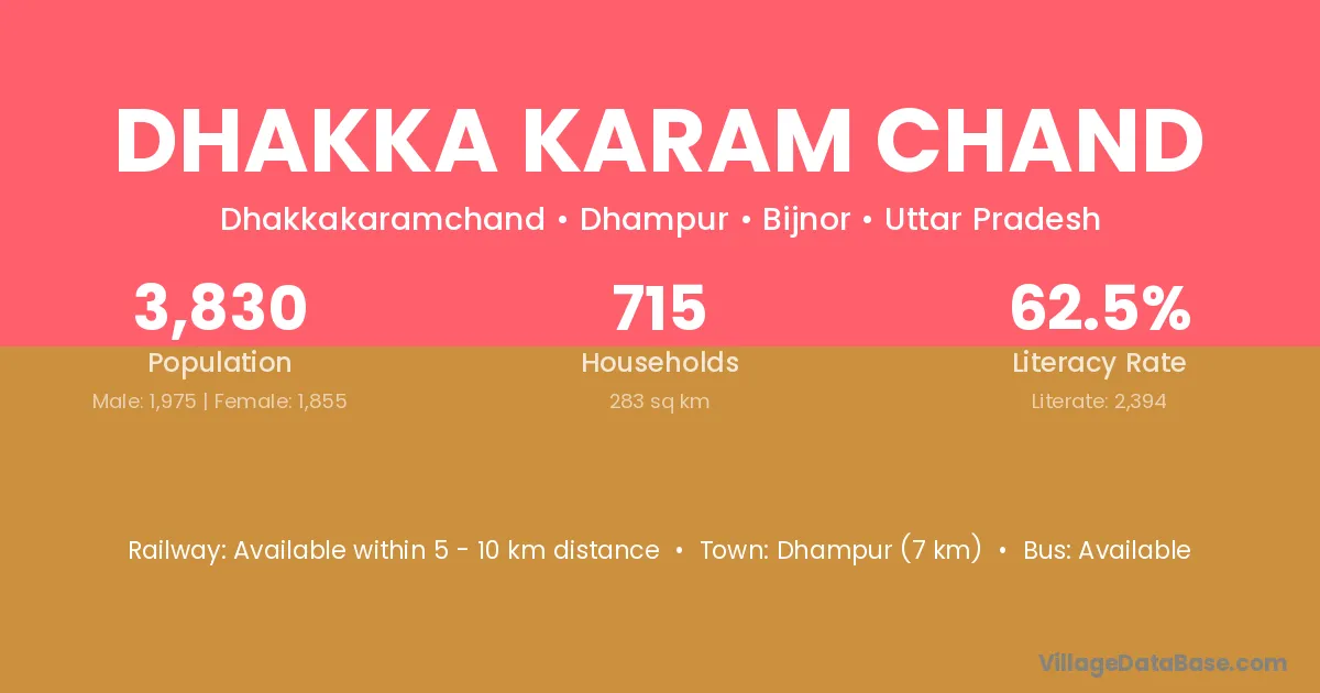 Dhampur (7 km) is the nearest town to Dhakka Karam Chand village for major economic activities and is located approximately 7 km away.