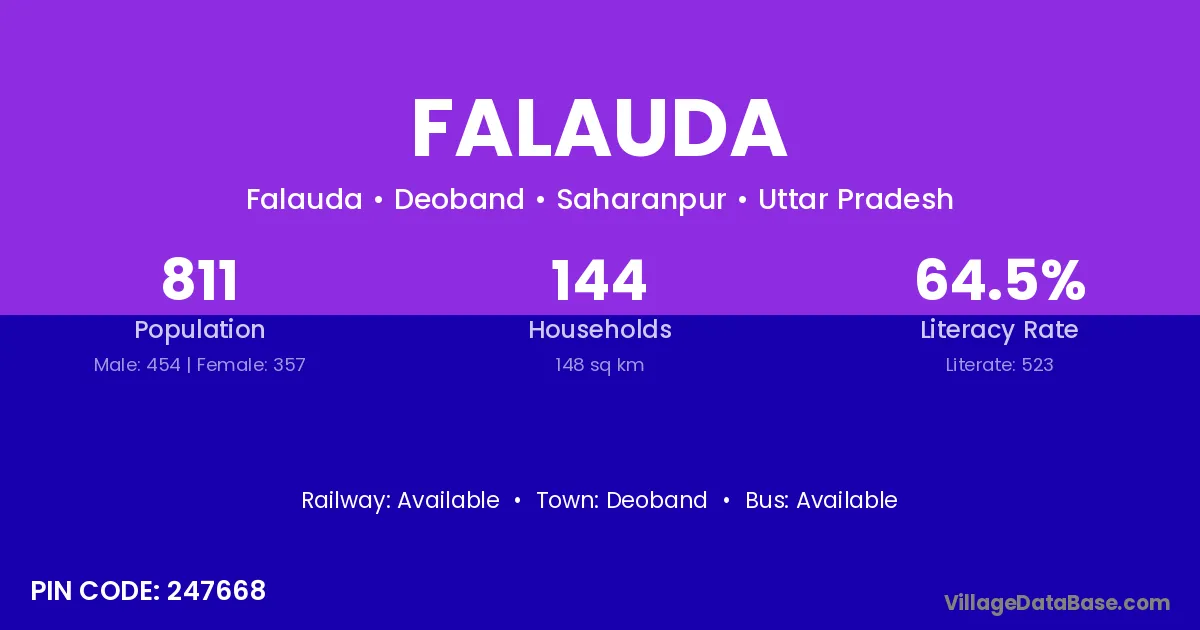 The literacy rate of Falauda village is 59.81%. Male literacy stands at 70.19% and female literacy at 48.61%.