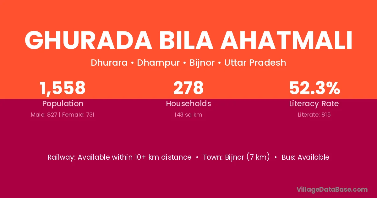 Bijnor (7 km) is the nearest town to Ghurada Bila Ahatmali village for major economic activities and is located approximately 7 km away.