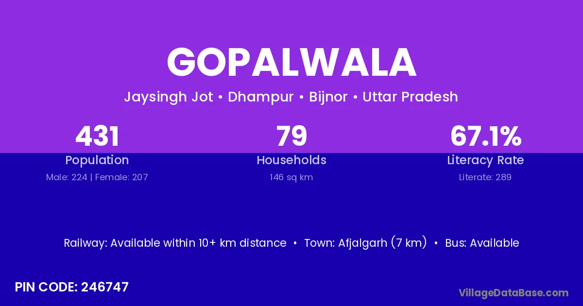 Afjalgarh (7 km) is the nearest town to Gopalwala village for major economic activities and is located approximately 7 km away.