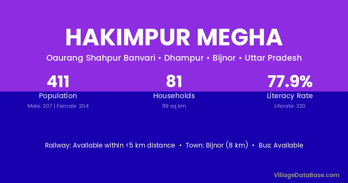 Hakimpur Megha village has a total population of 411 people, of which 207 are males and 204 are females.