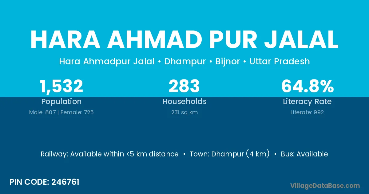 Dhampur (4 km) is the nearest town to Hara Ahmad Pur Jalal village for major economic activities and is located approximately 4 km away.