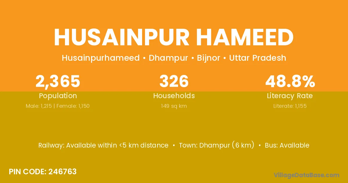 Dhampur (6 km) is the nearest town to Husainpur Hameed village for major economic activities and is located approximately 6 km away.