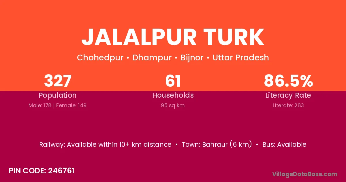 Bahraur (6 km) is the nearest town to Jalalpur Turk village for major economic activities and is located approximately 6 km away.