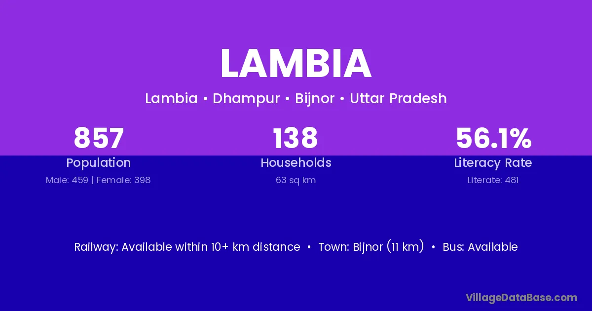 Bijnor (11 km) is the nearest town to Lambia village for major economic activities and is located approximately 11 km away.