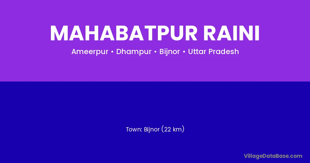 Bijnor (22 km) is the nearest town to Mahabatpur Raini village for major economic activities and is located approximately 22 km away.